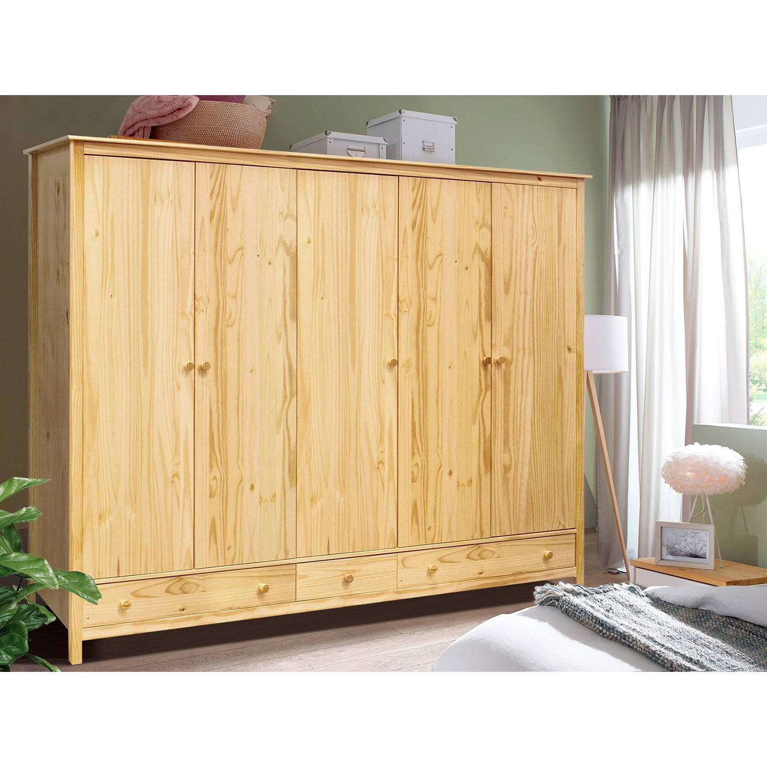 Ak ste viacčlenná rodina alebo len milujete módu a máte naozaj veľa oblečenia, tak skriňa 5-dverová TORINO by mohla byť určená práve pre vás. Je z masívnej borovice a je v lakovanom prevedení. Priestor v skrini je delený v pomere 2:1:2. V ľavej a pravej širšej časti sa nachádza priestranná šatníková tyč a polica na sezónne oblečenie či klobúky a čiapky. Na šatníkovú tyč môžete zavesiť šaty, kabáty, bundy alebo košele. V strednej úzkej časti sa nachádzajú 3 police na uloženie tričiek a svetrov. V spodnej časti sa nachádzajú 3 zásuvky s kovovými pojazdmi, sem zase môžete uložiť vašu spodnú bielizeň. Keďže je skriňa naozaj veľmi priestranná, určite v nej nájdete miesto aj na posteľnú bielizeň. Skvele bude vyzerať nielen na chate či chalupe, ale aj v moderne vybavenom dome. Doplňte skriňu nadstavcom a o úložný priestor už nikdy nebudete bojovať s ostatnými členmi domácnosti.