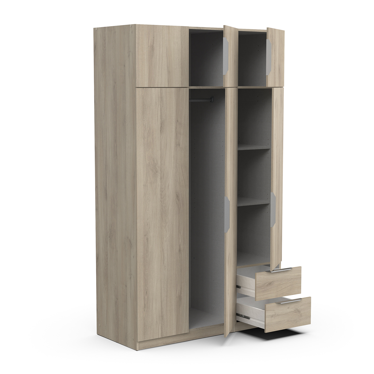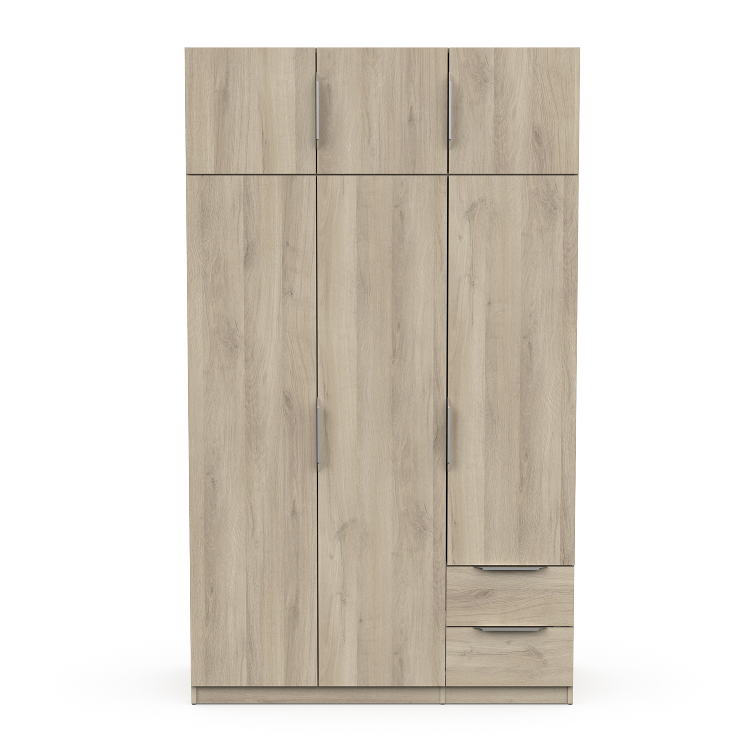Skriňa GHOST dub vo farebnom prevedení dub Kronberg je skvelou voľbou do akejkoľvek veľkej izby zariadenej týmto nábytkom. Skriňa je delená v pomere 2:1, ľavá časť skrine je opatrená šatníkovou tyčou a pravá časť ponúka 2 police na poskladanie ďalších odevov alebo bytového textilu. Šatník navyše obsahuje aj dve malé zásuvky s kovovými pojazdmi, ktoré využijete na uloženie drobnej bielizne či iných nevyhnutností. Priestranná a pevná skriňa pojme všetko vaše oblečenie. Skriňa môže slúžiť na ukladanie vecí ako v spálni, tak v detskej izbe. Skriňu 391394 je možné využiť aj na uloženie sezónnych vecí. V hornej časti sa totiž nachádza dostatok úložného priestoru schovaného za 3 dvierkami.