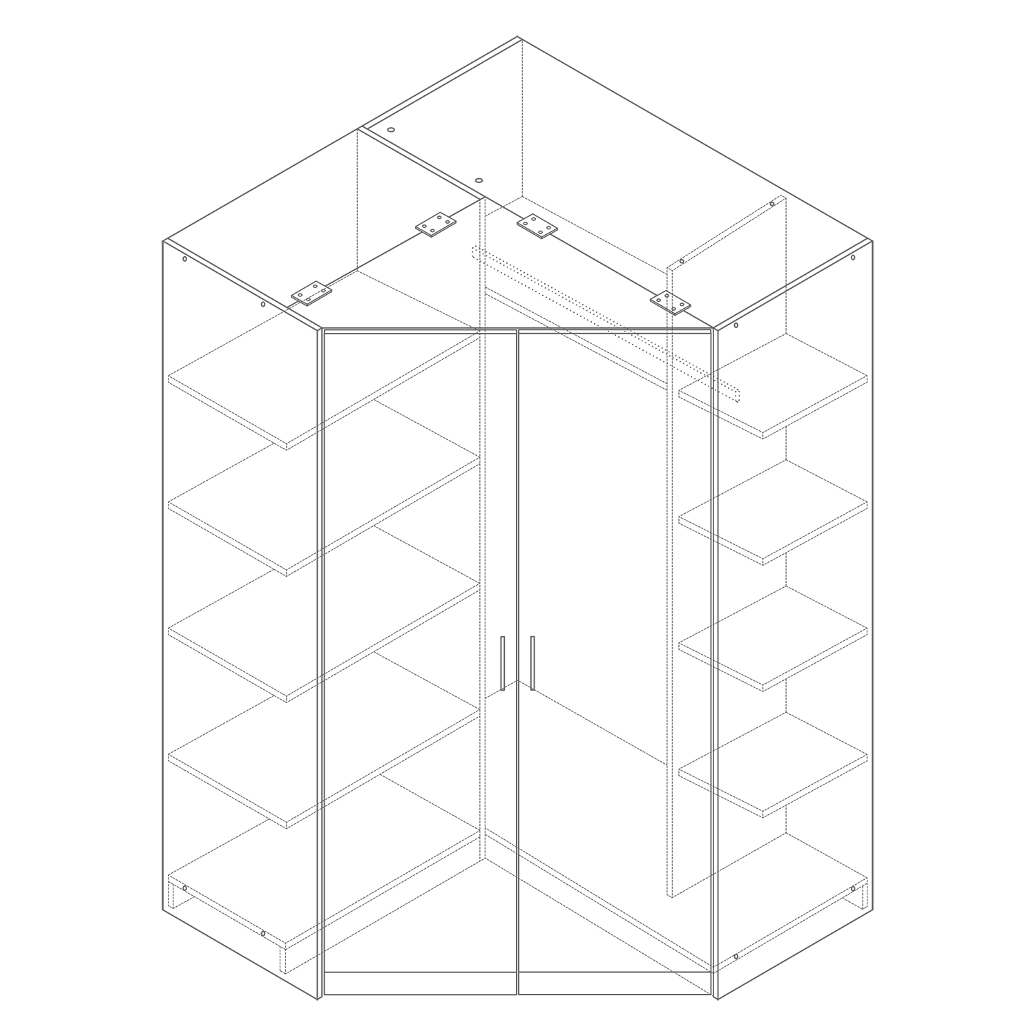 rohová šatníková skriňa, 9 políc a šatníková tyč