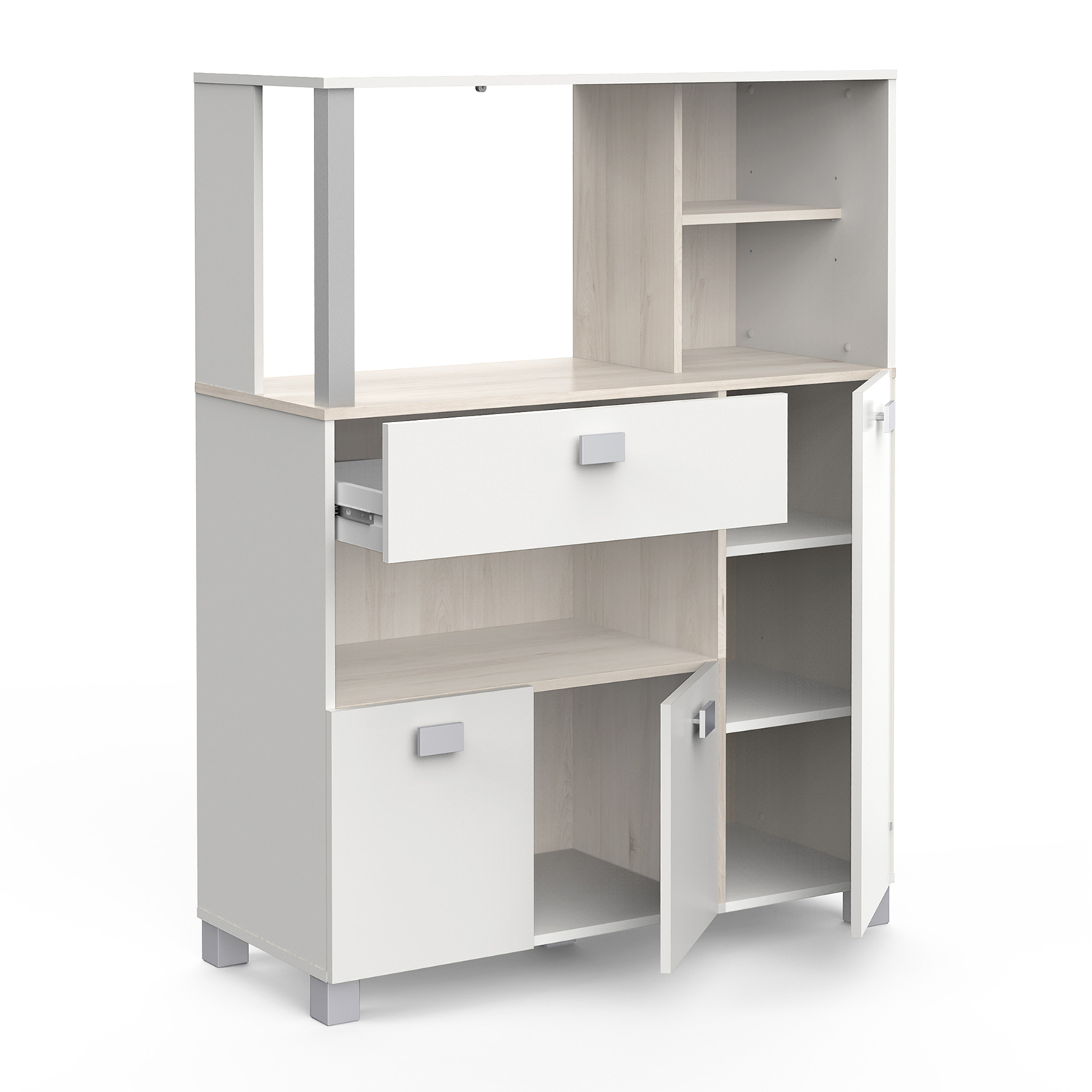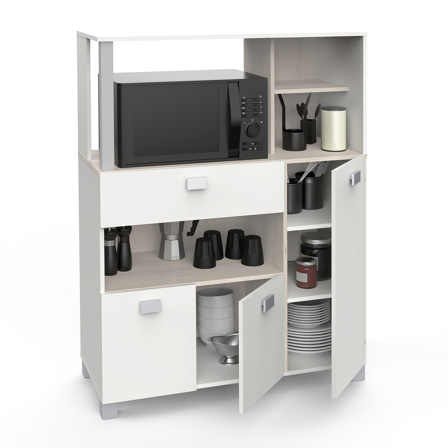 Nie každý disponuje priestrannou kuchyňou, preto by vám skrinka na mikrovlnnú rúru BASILIC mohla pomôcť s usporiadaním vecí v kuchyni. Do spodnej, a v tomto prípade najväčšej, skrinky môžete uložiť hrnce a panvičky. Do zatváracích políc napravo treba taniere a poháre. Do zásuvky s kovovými pojazdmi napríklad príbory. Úložného priestoru je dosť, preto každá vec bude mať svoje miesto. Nad priestorom na mikrovlnnú rúru je polica, ktorú môžete ozdobiť kvetinami. Farebné prevedenie je akácia / biela, takže táto skrinka skvele oživí každú kuchyňu robenú v bielej farbe.