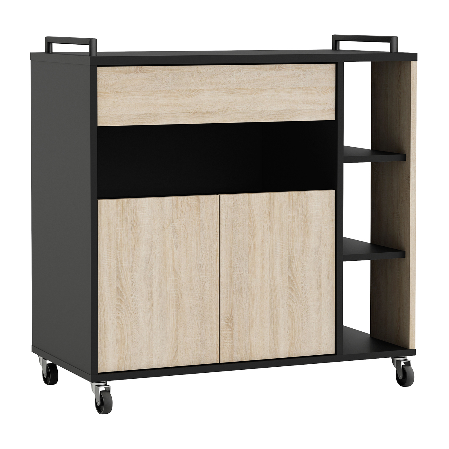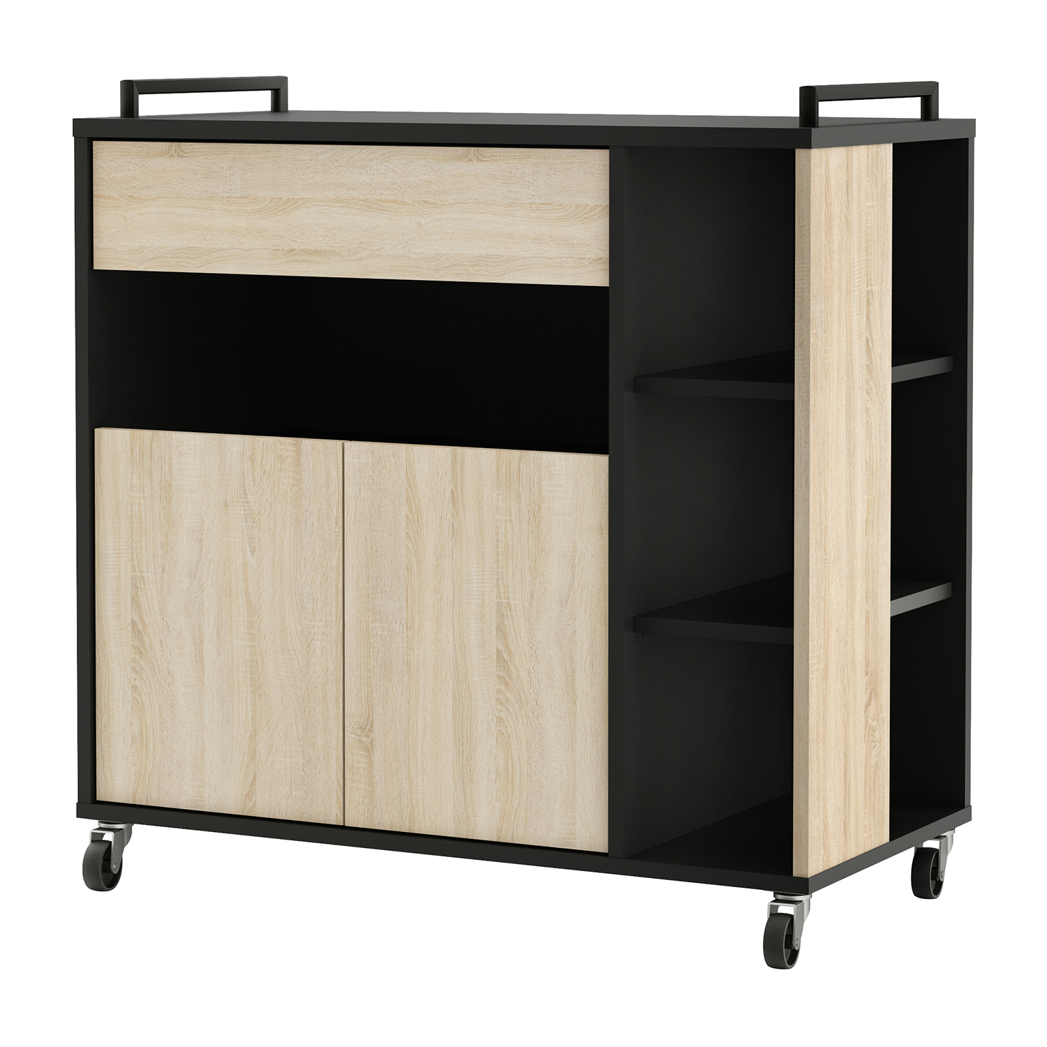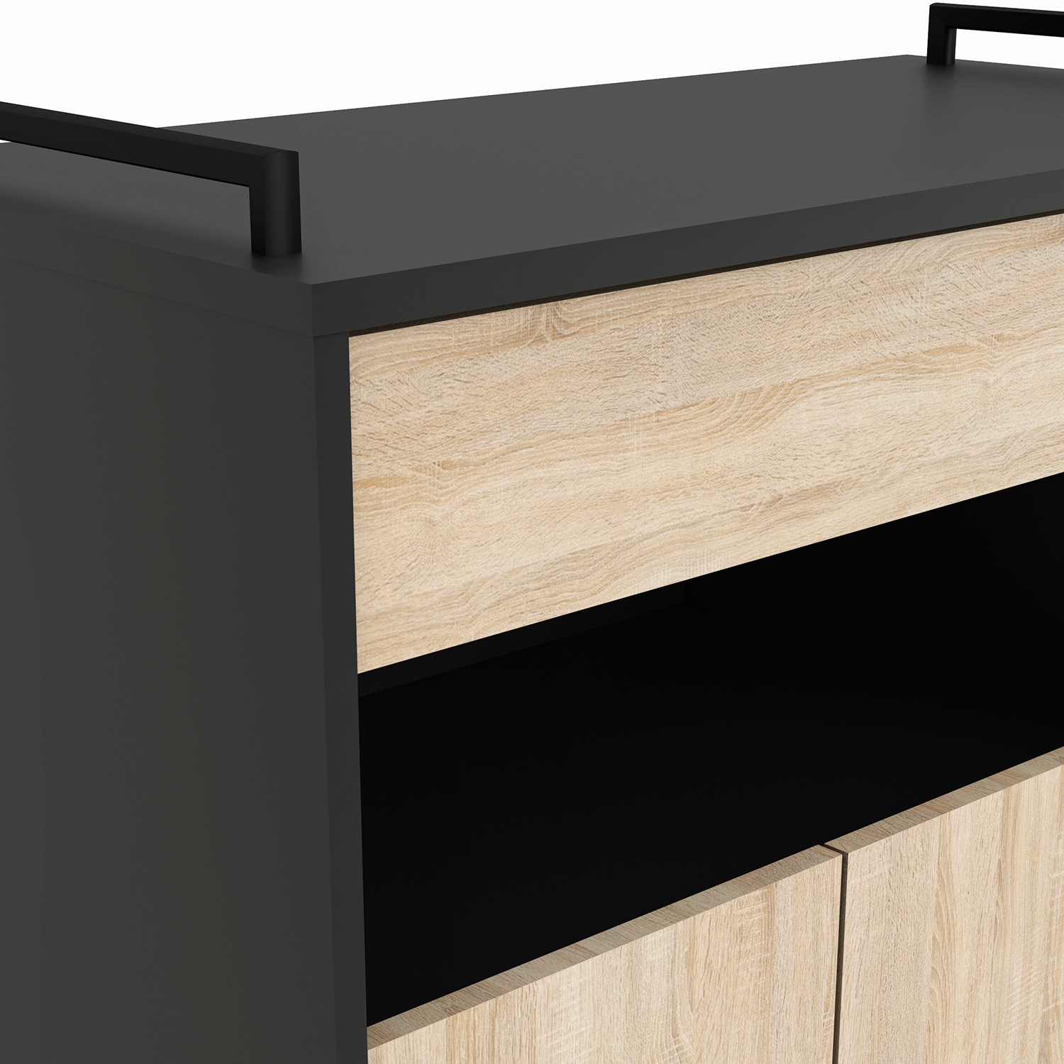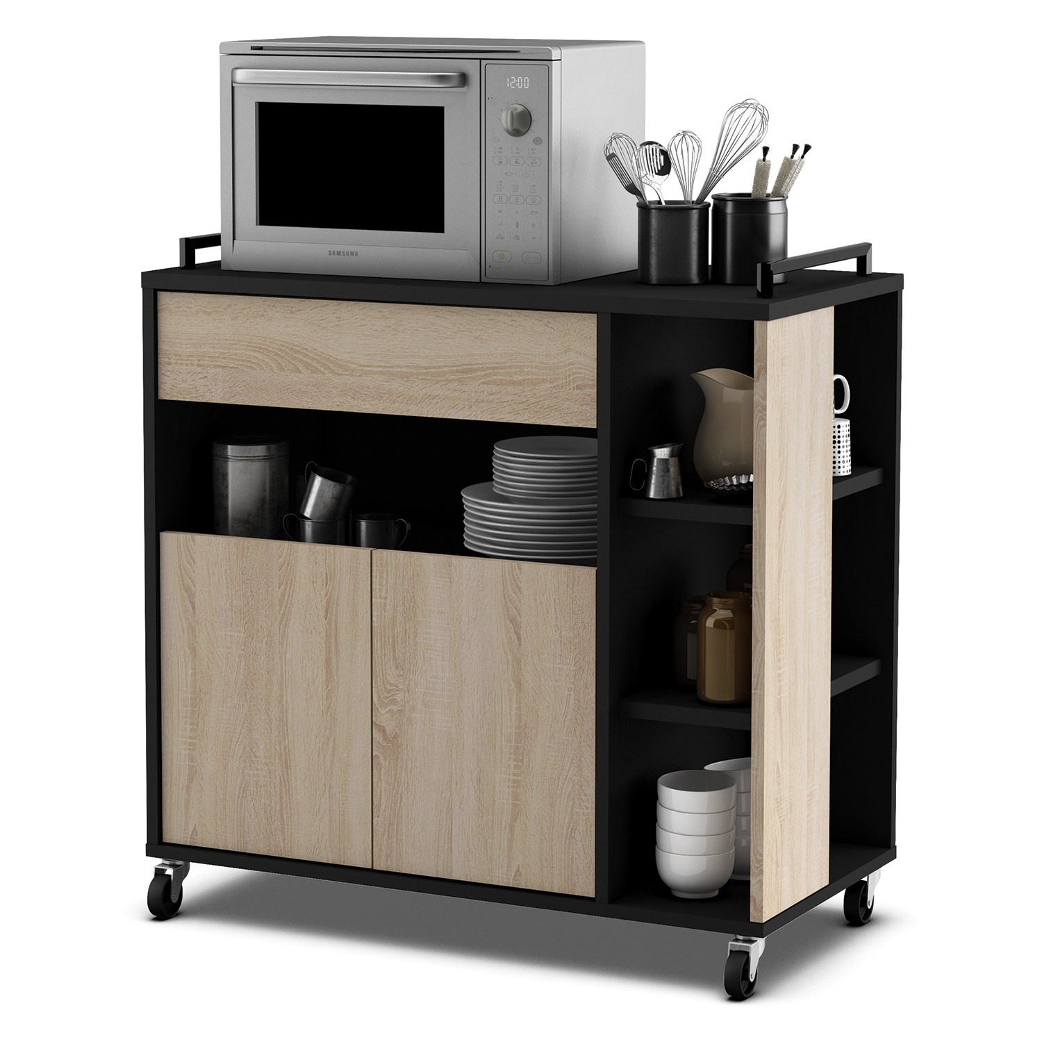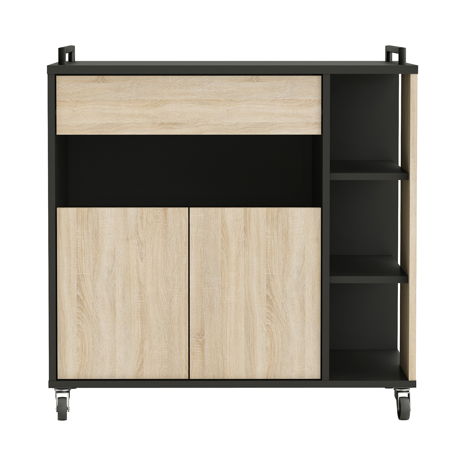 Štýlová skrinka na mikrovlnnú rúru INDUS vo farebnom prevedení dub Sonoma / čierna skvele vyrieši problém s úložným a odkladacím priestorom v kuchyni. Vďaka tejto skrinke vkusne uložíte riad, koreničky a na hornú dosku skrinky môžete dať mikrovlnnú rúru. Celá skrinka je pojazdná na kolieskach. Jednu zásuvku má s kovovými pojazdmi a tú môžete využiť pokojne aj na príbory. V spodnej časti sa potom nachádzajú 2 dvierka na uloženie rôzneho kuchynského náčinia.