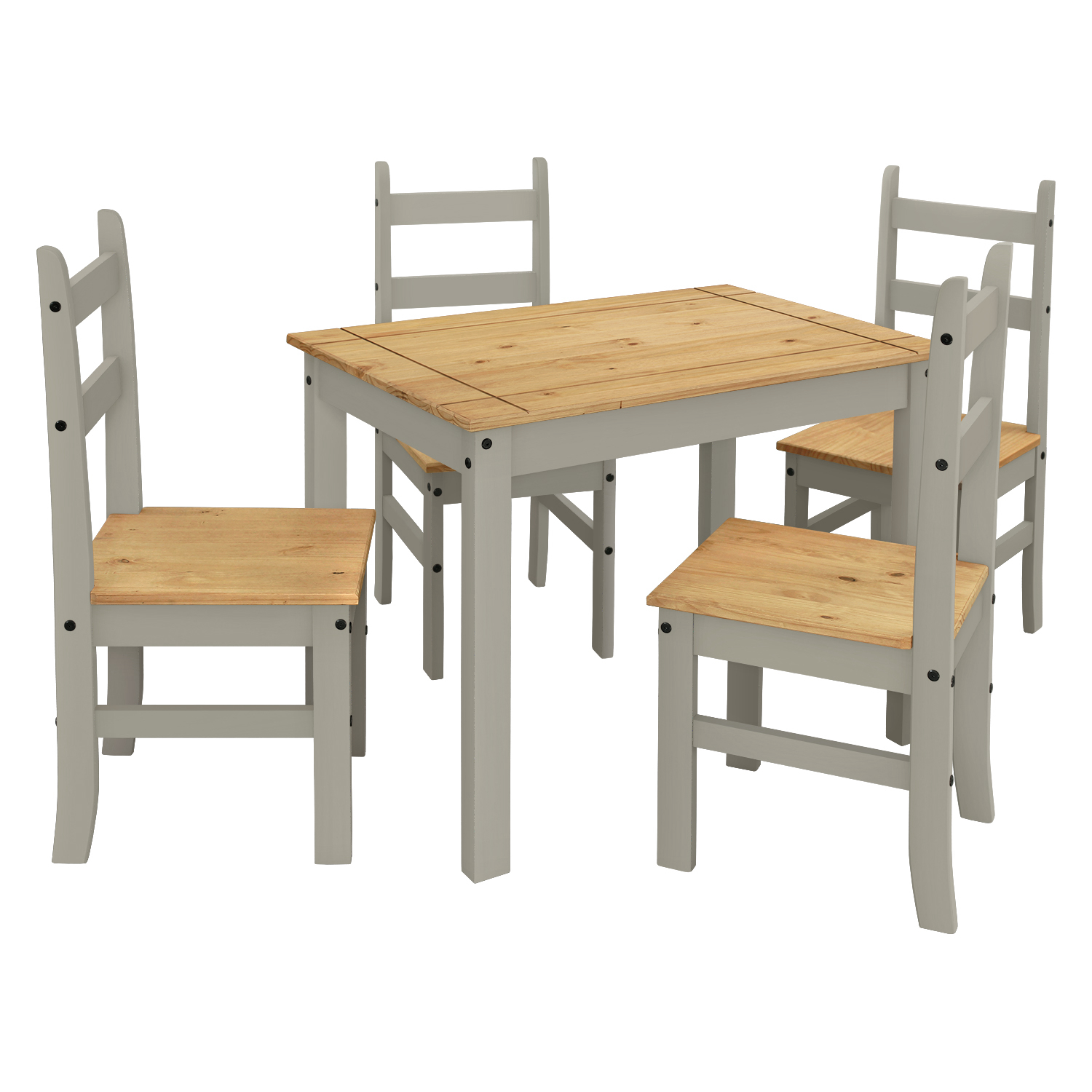 Pekný a priestranný jedálenský set je výhodou každej jedálne. Usadí nielen priatelov, ale aj vašu rodinu a môžete im dopriať nejaký lahodný pokrm, ktorý si spoločne vychutnáte práve vďaka setu CORONA 3. Stôl aj stoličky sú z masívnej borovice voskovanej v sivom a medovom odtieni. Nie je nad štýlové posedenie pri krásne prestretom jedálenskom stole. Spoločné stolovanie je nielen príležitosťou naplniť žalúdok niečím dobrým, ale slúži aj na utužovanie dobrých vzťahov v rodine. Robustný stôl a štyri klasické stoličky vám ponúknu dokonalé posedenie v kruhu vašich blízkych. Sedenie na pohodlných stoličkách s podopreným chrbtom bude vyhovovať úplne každému, okolo plochy stola tak radi zasadnete s rodinou i priateľmi. Stôl je pevným a veľmi podareným kúskom, na ktorého ploche uvítate predovšetkým chutné a rôznorodé jedlá.