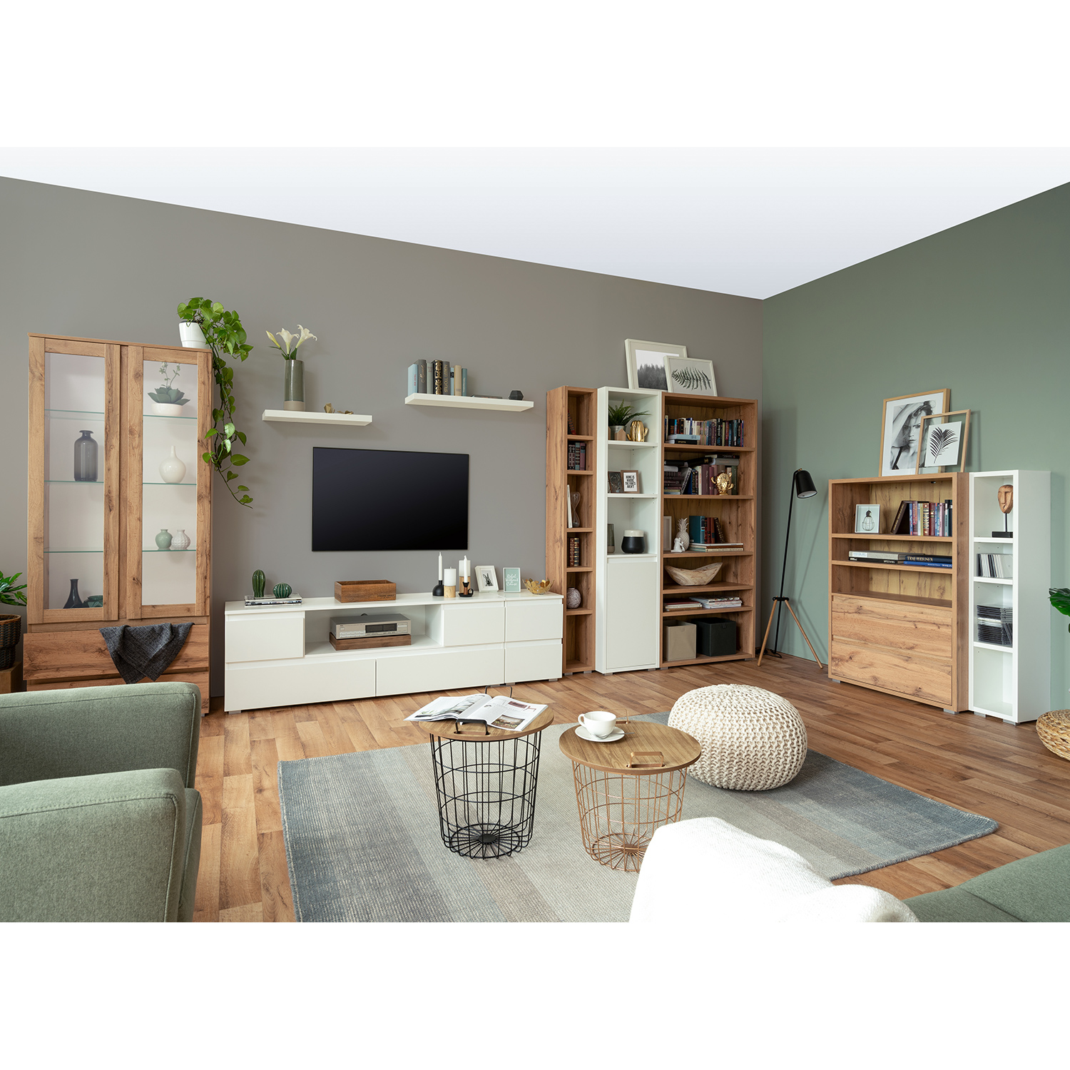 Kód produktu: FN2631farebné prevedenie zlatý dub 2 presklené dvere, 3 sklenené police 2 zásuvky, pojazdy s guličkovými ložiskami chrbát je obojstranný, možno zvoliť farebné prevedenie zlatý dub alebo biela