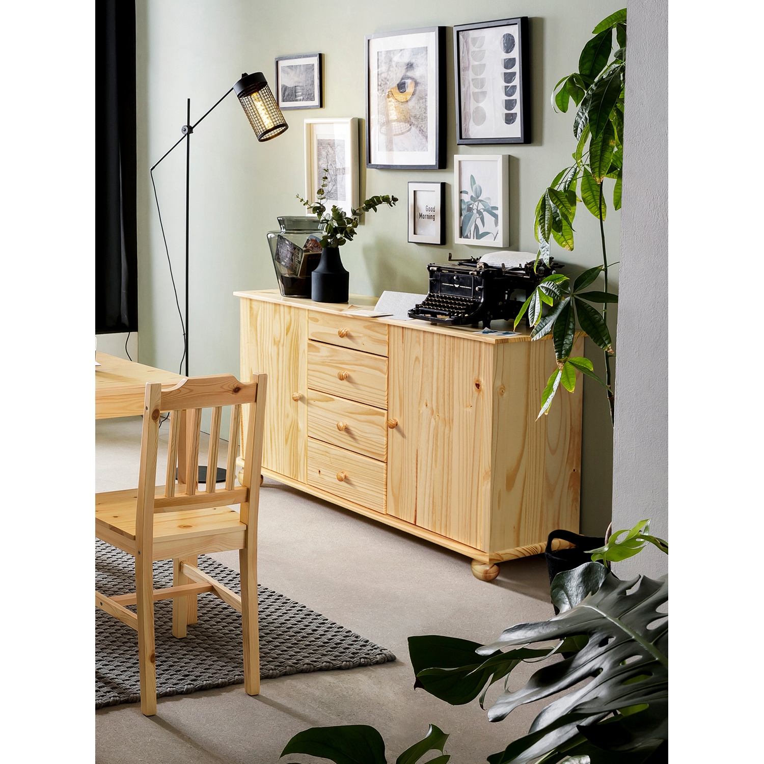 Zostava príborníka je poctivý kus nábytku, ktorý sa nevnucuje a napriek tomu priťahuje pozornosť. Je vyrobený z masívu borovica a má lakovaný povrch, ktorý robí jeho údržbu jednoduchú a chráni drevo pred každodenným opotrebovaním. Vďaka číremu laku vyzerá sviežo a čisto, a pritom zachováva svoju prirodzenú štruktúru a autentickú kresbu. Táto zostava je navrhnutá tak, aby fungovala v praxi, ale nevyzerala ako obyčajný upratovací nástroj. Horná časť ponúka uzatvárateľný úložný priestor ideálny na vystavenie keramického riadu, pohárov alebo dekorácií, ktoré chcete mať chránené, ale viditeľné. Vnútorné police pomáhajú udržať prehľad a využiť priestor efektívne. Spodná časť zostavy ponúka ďalšiu skrýšu pre veci, ktoré chcete mať skryté – obrusy, príbory alebo drobné kuchynské pomôcky. Zásuvky ponúkajú priestor pre tie veci, ktoré chcete mať po ruke. Všetky časti držia ticho a kľud vďaka kovovým pojazdom. Rozmery zostavy sú dostatočné, aby pojali všetky bežné veci v jedálni aj v kuchyni, a pritom sú tak akurát do stredných aj menších priestorov. Svoje miesto si nájde aj v kombinácii s rôznymi štýlmi od škandinávskych po klasické. Nenásilne vkĺzne do priestoru a prinesie doň poriadok a pokoj. Tento príborník nie je žiadna výstredná dekorácia. Je to spoľahlivý spojenec domácnosti, ktorá chce mať systém bez zmätku.